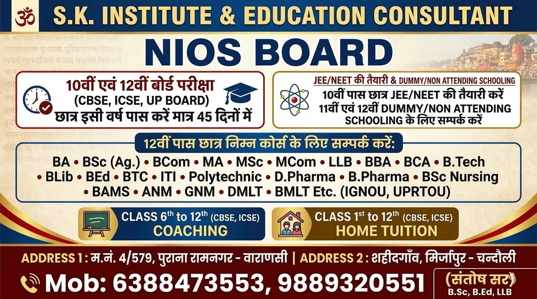 N.I.O.S Institute & Admission Consultant is a trusted education guidance center in Ramnagar, Varanasi, helping students with NIOS admission for 10th and 12th class through the National Institute of Open Schooling. Since 2018, we have been assisting students and parents with the complete admission process including subject selection, documentation support, and exam guidance. If you are looking for reliable support for NIOS in Varanasi, our institute also works as NIOS board admission consultants in Varanasi, providing clear guidance for students who want to continue their education through the NIOS open schooling system with proper counseling and academic support.